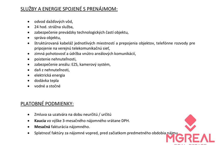 Ponúkame Vám na prenájom administratívne priestory v lokalite Bratislava-Nové Mesto, Stará Vajnorská. Nachádzajú sa na 3.p. administratívnej budovy v logistickom centre a tvoria krídlo budovy (12 miestností), majú vlastnú kuchynku a soc zázemie. Výmera celku: 415,12m2.Vybavenie: klimatizácia, ústredné kúrenie, vlastná regulácia tepla, štrukturovaná kabeláž, interiérové horizontálne žalúzie, koberce v kanceláriách. Stav objektu: kompletná rekonštrukcia. Areál ponúka priestor na nákladku a výkladku, vonkajšie parkovacie státia pre osobné i nákladné autá, podzemnú garáž pre osobné autá. 24h strážna služba, CCTV kamerový systém. Cena od 10,90 Eur/m2/mes, zľava pri zmluve na 5r s koneťnou cenou 5.741,11€/mesiac vrátane energií. Možnosť až 15 vyhradených parkovacíc miest za 45Eur/miesto. K cene sa pripočítava príslušná DPH. Províziu neplatíte!